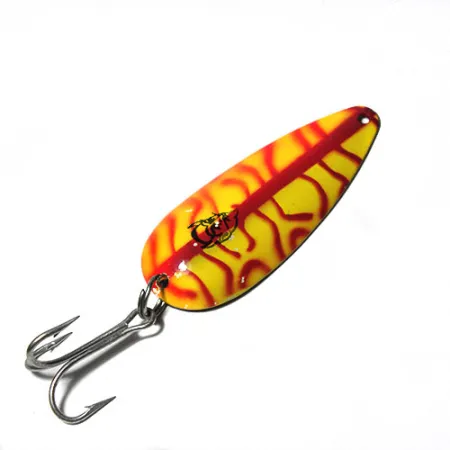 Яскраве жовте покриття з хвилястими червоними смугами та вертикальною лінією по центру вирізняє лицьову сторону цієї класичної американської коливалки. Ця модель від Eppinger з артикулом 0275 має довжину 3 дюйми (7,5 см) та солідну вагу 3/4 унції (21 г). На звороті приманки — полірована позолота з клеймом «DARDEVLET DEARBORN MI.». Цей напис свідчить, що блешня виготовлена вже після 1959 року, коли компанія перенесла своє виробництво. Оснащення складається з одного гострого трійника, закріпленого заводним кільцем у хвостовій частині, а в головній частині передбачено акуратний отвір для кріплення волосіні. На увігнутому боці цієї моделі розташований впізнаваний логотип із головою диявола. Сама ж форма пелюстки розроблена так, щоб забезпечити виразну гру з перевалими під час рівномірної проводки. Стан оцінюється на 4/5: помітні лише незначні сліди використання, фарба лишається глянцевою, а металеве покриття на звороті зберегло свій первісний блиск. Це чудовий зразок блешні з товстостінної латуні, виготовленої за фірмовою технологією Eppinger, що дозволяє приманці швидко досягати потрібної глибини після закидання.