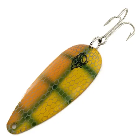Маючи жовто-зелене забарвлення «під луску» на помаранчевому тлі, ця вінтажна коливалка є зразком майстерності, що зробила Детройт центром інновацій у виробництві рибальських снастей. На лицьовій стороні Eppinger Dardevle Dardevlet завдовжки 7 см (2 3/4") нанесено культовий логотип із головою чорта — впізнаваний знак для колекціонерів та рибалок, які полюють на щуку чи лосося. При вазі 19 г (2/3 унції) блешня має вигнуте металеве тіло, зворотний бік якого виконаний у полірованому нікелі. На звороті викарбувано написи DARDEVLET та DETROIT, U.S.A., що свідчить про період виробництва до переїзду компанії у 1959 році. Цей екземпляр (артикул 11798) зберігся у відмінному стані з оцінкою 5/5, має яскраве лакофарбове покриття та чисту поверхню металу. Вона оснащена міцним трійником на заводному кільці та підходить для різних технік лову — як у закид, так і тролінгом.