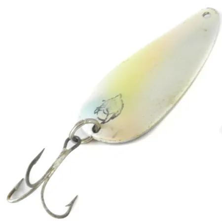 М’яке перламутрове покриття Rainbow Pearl плавно переходить по всій лицьовій стороні цієї блешні вагою 21 г (3/4 унції), демонструючи ледь помітний градієнт, завдяки якому Eppinger Dardevle Dardevlet заслужила свою репутацію під час лову у прозорій воді. При довжині 7 см (2 3/4 дюйма) ця модель має класичну нікельовану тильну сторону — такий варіант покриття часто радять для сонячної погоди, щоб створити природне виблискування. Культовий логотип із головою диявола чітко видно біля заводного кільця; він нанесений за допомогою фірмових штампів, що визначають вигляд цієї мічиганської легенди. Риболови впізнають артикул 4215, який відповідає саме цій ваговій та розмірній категорії. Трійник кріпиться через міцне заводне кільце до увігнутого тіла приманки, конструкція якого розрахована як на лов у закид, так і на тролінг. Що стосується збереженості, блешня оцінюється на впевнені 4/5: поверхня залишається гладенькою, з лише незначними слідами перебування у коробці зі снастями. Ледь вловимі жовті та блакитні відтінки поверх білої основи створюють м’який візуальний силует, призначений для рівномірної проводки. Ця виготовлена в США блешня продовжує традиції заводу в Дірборні, зберігаючи ту саму характерну видовжену форму, яка десятиліттями залишається базовою для ловців щуки та баса.