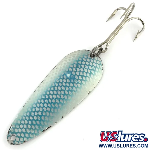 Синя сітка-луска виразно виділяється на білому покритті цієї класичної блешні-коливалки. На відполірованій нікельованій спинці чітко виштампувана назва «DARDEVLET» разом із написом «DETROIT U.S.A.», що свідчить про походження виробу з ранніх партій компанії Eppinger. При вазі 21 г (3/4 унції) та довжині 7 см (2 3/4 дюйма) ця модель під артикулом 8722 має класичні параметри для далеких закидів або глибоководного тролінгу. Лицьова сторона має характерну фактуру луски, створену синім напиленням поверх білої основи, що забезпечує високу контрастність і помітність у воді. Блешня оснащена оригінальною фурнітурою, включаючи один міцний трійник на заводному кільці та отвір для кріплення волосіні в носовій частині. Зі станом 4/5 цей екземпляр виглядає дуже гідно: поверхні чисті, а металевий зворотний бік зберіг яскравий блиск. Це повністю робочий зразок детройтської майстерності з легендарної лінійки Eppinger.