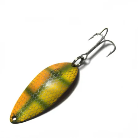 Маючи довжину 5,5 см та солідну вагу в 14 г, ця коливальна блешня є класичним прикладом американського виробництва приманок. На зворотному боці мідного відтінку викарбувано напис «DEVLE DOG 700 DETROIT U.S.A.». Цей екземпляр від Eppinger втілює спадщину майстерні Лу Еппінгера, заснованої у Мічигані ще в 1906 році. Лицьова сторона вирізняється яскравим поєднанням жовтого, зеленого та помаранчевого кольорів, нанесених у вигляді дрібного стільникового візерунка, що імітує луску. Ця конкретна модель (артикул 0260) має добре збережене покриття, стан якого оцінюється на 4 з 5. Фурнітура залишається робочою: у хвостовій частині на заводному кільці закріплено гачок-трійник. Колекціонери оцінять чіткість літер на звороті — характерну ознаку оригінальних штампів, які компанія Eppinger використовувала для своєї лінійки Dardevle. Мідна основа приманки злегка проступає по краях, що додає виробу характеру, не псуючи загального вигляду. Ця модель була розроблена для ловлі у закид та тролінгу, залишаючись перевіреним вибором для тих, хто полює на хижака у водоймах Північної Америки.