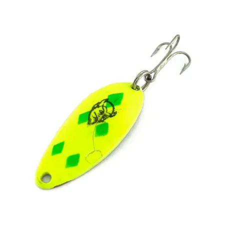 Поверхня цієї блешні завдовжки 4 см (1 1/2") вкрита яскравою фарбою кольору «шартрез», що робить її чудовим вибором для ловлі в умовах недостатнього освітлення або в каламутній воді. Ця модель Eppinger Dardevle Devle Dog 5200 (артикул 9384) має виразний візерунок із зелених ромбів та класичне зображення диявола на лицьовому боці. Світлонакопичувальне покриття додає функціональності приманці, історія якої бере початок у штаті Мічиган ще відтоді, як Лу Еппінгер заснував виробництво в Детройті. Вага блешні становить 7 г (1/4 унції); вона має фірмову довгасту форму та увігнуту поверхню, яку компанія Eppinger вдосконалювала протягом понад ста років. Примірник перебуває в ідеальному стані (5/5), а чиста нікельована підкладка створює металеві відблиски, що контрастують з яскравим кольором лицьової сторони. Ця приманка американського виробництва залишається надійним вибором для лову в закид, зберігаючи високі стандарти якості, притаманні заводу компанії в Дірборні.