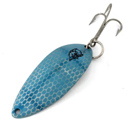 Штамповане маркування «DEVLE-DOG 7700 DETROIT U.S.A.» на полірованій нікелевій зворотній стороні засвідчує історичну приналежність цієї класичної блешні від Eppinger. Лицьова сторона має світло-блакитне покриття, оздоблене сріблястим візерунком у вигляді бджолиних стільників та впізнаваним логотипом із головою чорта. При довжині 2 1/4 дюйма (5,5 см) та вазі 1/2 унції (14 г), Dardevle Devle Dog 7700 (артикул 15188) є солідною блешнею-коливкою. Цей конкретний екземпляр перебуває у стані 5/5, зберігши свій глянцевий блиск та чітке, глибоке маркування. Оснащення включає посилене заводне кільце та стандартний трійник. Її увігнутий профіль розроблений для стабільної гри на різних швидкостях проводки — цей дизайн Лу Еппінгер вдосконалював у своєму підвалі в Детройті ще з 1906 року. Полірована срібляста внутрішня частина створює яскравий контрастний відблиск до блакитної луски на зовнішній стороні.