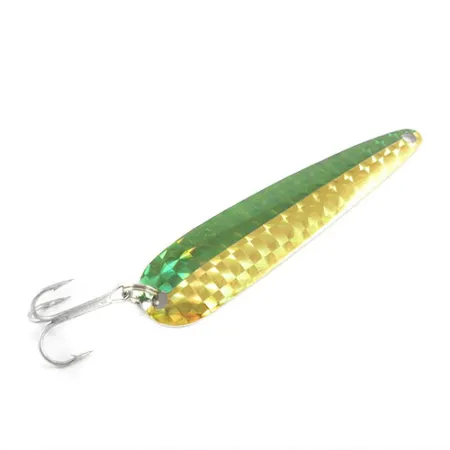 Голографічна «луска» зеленого та жовтого кольорів виблискує на світлі на опуклій стороні цієї 8-сантиметрової блешні для тролінгу. На відполірованому нікельованому звороті чітко вибито назву Flutter-Chuck та місце виробництва — Детройт, США. Це данина історії компанії Eppinger, яка розпочалася в підвалі Лу Еппінгера ще 1906 року. Цей конкретний екземпляр з артикулом 2942 важить 1/4 унції (8 г). Він виготовлений із тоншого металу, ніж традиційні моделі Dardevle, що спеціально розраховано на особливості тролінгової ловлі. Оснащення складається з одного заводного кільця у хвостовій частині та трійника сріблястого кольору. Стан оцінюється на 5/5: приманка має чистий дзеркальний нікельований зворот та повністю збережений малюнок на лицьовій стороні. Контрастні жовті та зелені відтінки на фоні металевих відблисків створюють помітний силует під час проведення у товщі води.