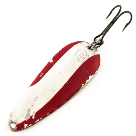 Класичне нікелеве покриття на зворотному боці цієї коливалки прикрашене чітким штампом «DARDEVLE IMP U.S.A.» — фірмовим знаком мічиганського виробництва компанії Eppinger. На лицьовій стороні з культовим червоно-білим смугастим візерунком помітні сліди часу: потертості та сколи фарби по краях, крізь які проступає метал. Цей екземпляр з артикулом 11340 має довжину 5,5 см (2 1/4 дюйма) та важить 11 г (2/5 унції). У верхній частині на білу фарбу нанесено ледь помітне лого у вигляді голови диявола — характерна деталь від виробника з Дірборна. Стан приманки оцінюється на 4/5; вона повністю зберегла робочі властивості, оснащена міцним трійником і надійним заводним кільцем. Увігнута форма корпусу забезпечує стабільну гру з характерними коливаннями під час закидання чи тролінгу, вдало імітуючи рухи пораненої рибки.