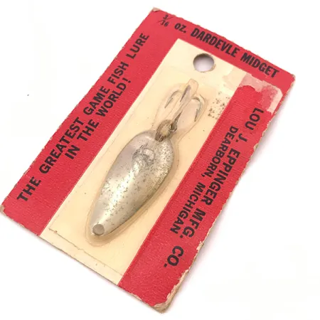 Ця коливна блешня довжиною 1 1/2 дюйма (3,5 см) має покриття «полірований нікель», що створює поверхню з високою відбивною здатністю, яку колекціонери цінують за лаконічний класичний вигляд. Виготовлена компанією Lou J. Eppinger Mfg. Co. у Дірборні, штат Мічиган, ця Dardevle Midget є взірцем класичного американського рибальського спорядження; виробництво переїхало до Дірборна у 1959 році. Вага приманки становить рівно 3/16 унції (6 г), вона представлена на оригінальній червоно-білій картонній підкладці з артикулом 3914. На лицьовій стороні блешні викарбувано фірмове клеймо виробника у вигляді голови диявола — характерна ознака оригінальних штампів, що використовувалися на їхньому заводі в США. Оснащення включає гострий трійник, закріплений на посиленому заводному кільці, розрахованому на надійну роботу при закиданні або тролінгу. Цей екземпляр не був у використанні та зберігся в оригінальній упаковці, яка має незначні потертості на кутах та біля перфорованого отвору для підвішування.