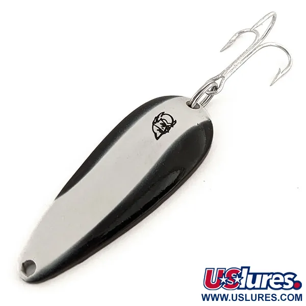 На латунному звороті цієї блешні чітко вибито клеймо «ROK'T-DEVLE IMP. DEARBORN MICH.», що підтверджує її походження після переїзду компанії Eppinger у 1959 році. Приманка довжиною 2 1/4 дюйма (5,5 см) та вагою 3/4 унції (21 г) має контрастне забарвлення лицьового боку: одна половина пофарбована у глибокий чорний колір, а інша — це поліроване срібло з легендарним логотипом у вигляді голови чорта. Це поєднання кольорів (код товару 13136) розроблене для лову у закид; класична увігнута форма «крапля» забезпечує характерну гру завдяки опору води. Цей екземпляр не був у використанні та зберігся у відмінному стані, що відповідає оцінці 5/5. Фарба лежить ідеально, а латунь на звороті має чистий оригінальний блиск без жодних слідів експлуатації. Блешня оснащена одним великим трійником, закріпленим на міцному заводному кільці. Відтоді як Лу Еппінджер почав вручну виготовляти ці приманки в Детройті у 1906 році, фірмові матриці для серії Dardevle зберігають особливу геометрію, яку колекціонери впізнають миттєво. Ця блешня є чудово збереженим зразком історії американських рибальських снастей, виготовленим на заводі в Дірборні, штат Мічиган.