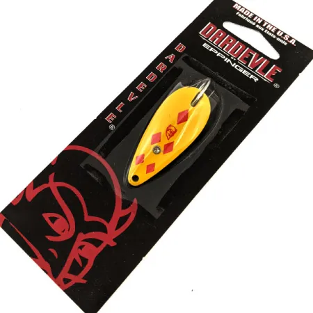 П’ять червоних ромбів контрастно виділяються на яскраво-жовтому випуклому боці цієї блешні-незачіпляйки Eppinger Dardevle Spinnie. Приманка з артикулом 20297 має вагу 1/4 унції (7 г), довжину 1 3/4 дюйма (4,5 см) і виконана в популярному забарвленні «Five of Diamonds». Конструкція-незачіпляйка оснащена одинарним гачком із дротяним захистом, що дозволяє закидати приманку в зарості або коряжник, де зазвичай тримається бас, форель чи окунь. Виготовлена на латунній основі, ця блешня вироблена в США за допомогою фірмових штампів компанії Eppinger. Приманка не була у використанні й постачається в оригінальній чорно-червоній упаковці із заводським номером 9517. Ця модель продовжує традиції бренду Eppinger, виробництво якого переїхало до Дірборна, штат Мічиган, у 1959 році. Класичний логотип із головою диявола на підкладці підкреслює історію виробництва снастей, що розпочалася в Детройті ще 1906 року.