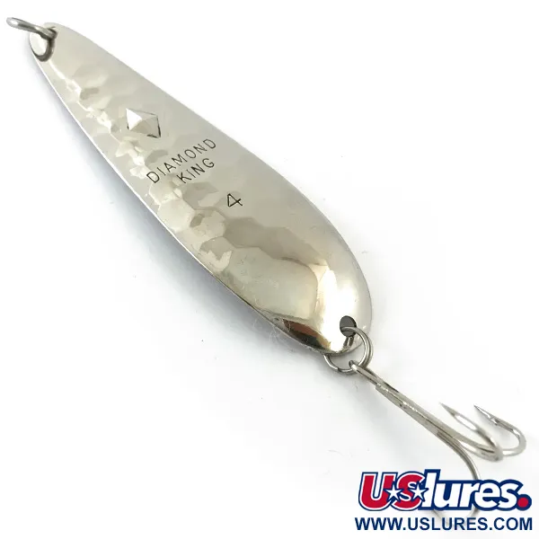 Сріблясте покриття з карбованою текстурою, як на цій Luhr Jensen Diamond King 4, створює класичні відблиски, на які любителі тролінгу покладаються десятиліттями. При вазі 14 г (1/2 унції) та довжині 9,5 см (3 3/4 дюйма) цей екземпляр з артикулом 4657 демонструє високу якість виготовлення, притаманну виробам зі США. На увігнутій внутрішній стороні чітко викарбувано назву «DIAMOND KING» та номер «4» в оточенні виразної карбованої фактури. Опуклу сторону майже повністю вкриває чіткий малюнок у вигляді бджолиних сот або шестикутників, який переривається лише помітною рельєфною деталлю у формі ромба у верхній частині. Ця приманка перебуває в ідеальному стані (5/5) і виглядає чудово збереженою завдяки блискучим металевим поверхням та гострому трійнику. Оснащення складається з міцних заводних кілець, що з'єднують місце кріплення жилки та задній гачок, і розраховане на значні навантаження під час тролінгу. Світловідбивні властивості подвійної текстури — карбованої зсередини та шестикутної зовні — забезпечують максимальну помітність приманки на різних глибинах.