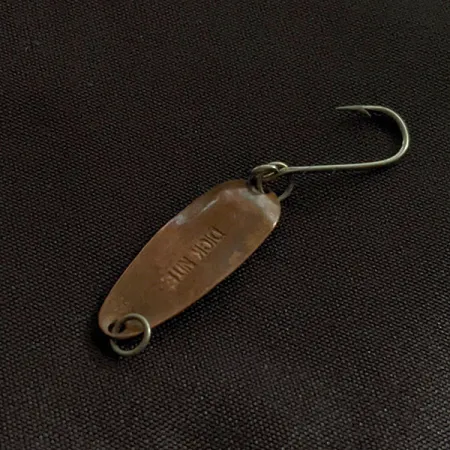 На увігнутій поверхні цієї мідної коливалки викарбувано назву «DICK NITE». Вона є класичним зразком американських снастей зі штату Вашингтон. Приманка важить лише 1 г (1/32 унції) при довжині 2,5 см (1 дюйм) і призначена для ультралайтового лову, де необхідний мініатюрний силует. Покриття з чистої міді забезпечує особливий природний відблиск, що відрізняється від яскравого сяйва хрому чи срібла. Блешня оснащена одинарним гачком типу «siwash» із широким піддівом, закріпленим на заводному кільці — такий монтаж зазвичай обирають для ловлі форелі або кокані на течії. Додаткове заводне кільце в носовій частині гарантує надійне кріплення до тонких повідців або вертлюжків. Приманка (арт. 22940) у стані 4/5: металева поверхня та місця кріплення фурнітури добре збережені.