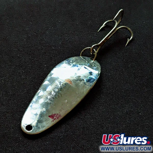Карбоване сріблясте покриття вкриває опуклу сторону цієї блешні, створюючи багатогранну поверхню для яскравих відблисків. На зворотному боці вибито маркування Dr.Walker's Johnny REB та вказано вагу 1/3 унції (10 г). Цей екземпляр під артикулом 18542 має довжину 4,5 см (1 3/4 дюйма) та вирізняється виразною червоною «точкою атаки» біля хвостової частини. Оснащення складається з надійного трійника, закріпленого через заводне кільце, а у вузькій носовій частині є отвір для кріплення жилки. Стан 4/5: світловідбивна карбована фактура добре збереглася, а клейма виробника на звороті залишилися чіткими. Тіло краплеподібної форми забезпечує впевнений профіль для лову в закид.