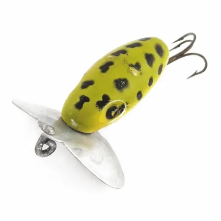 Іконічна металева лопать з чітким штампуванням «Jitterbug» та «Fred Arbogast, Akron, Ohio» визначає класичний силует цього 1 1/2" (4 см) поверхневого кроулера. У забарвленні Green Frog корпус має яскраво-жовто-зелену основу з виразними чорними плямами та чистим кремовим черевцем. Завдяки вазі 1/8 унції (4 г) цей компактний розмір був розроблений спеціально для легких снастей та делікатних технік лову з поверхні. Два гвинти надійно кріплять широку серцеподібну алюмінієву лопать до носової частини, що створює ритмічне хлюпання під час проводки. Оснащення включає один задній трійник, що відповідає оригінальній конфігурації для цієї невеликої моделі. Стан оцінюється як 4/5: фарба здебільшого збережена, з незначними ознаками віку, характерними для вінтажних приманок. Артикул товару #24568 для цього варіанту Green Frog.