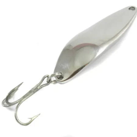 На внутрішній увігнутій поверхні чітко викарбуване клеймо GATOR, що свідчить про традиції американського виробництва приманок, які беруть початок ще з 1976 року. Ця масивна коливалка вагою 35 г (1 1/4 унції) та довжиною 8,7 см (3 1/2") має необхідну вагу для далеких закидів або утримання глибини під час тролінгу. Для виготовлення цієї моделі використана високоякісна нержавіюча сталь марки 304, завдяки якій нікелеве покриття зберігає високу відбивну здатність. У хвостовій частині на міцному заводному кільці встановлено потужний трійник, розмір якого відповідає великому хижаку, на якого розрахована ця приманка. Даний екземпляр з артикулом 3286 перебуває в ідеальному стані (5/5), повністю зберігши оригінальний дзеркальний блиск по всьому корпусу.