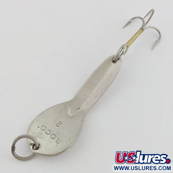 З чітким штампом «LOCO» 2 на звороті, ця блешня-коливалка вагою 1/4 унції (7 г) демонструє класичну геометрію зі зміщеним вигином, яку Glen Evans першим вивів на ринок. Нікельований корпус довжиною 2" (5 см) має виразну форму краплі, що звужується до вузької шийки — профіль, збалансований для презентації на мілководді на глибині до 3 футів (1 м). Світловідбиваючі голографічні вставки «шахівниця» нанесені на корпус та верхню частину, створюючи багатогранний відблиск для провокування клювання у стоячій воді або вздовж кромки трави. Зразок зберігся в ідеальному стані 5/5, має яскраве нікелеве покриття та оригінальний жовтий кембрик на цівці трійника. Хоча пізніше модель випускалася брендом Luhr Jensen, ця версія від Glen Evans є чистим прикладом раннього дизайну. Розподіл ваги забезпечує стабільну подачу при закиданні до структур або під час рівномірного тролінгу. Артикул товару: 24528.