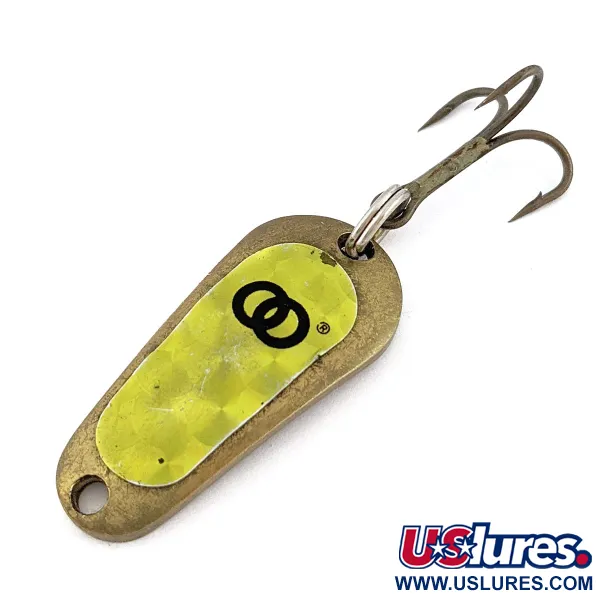 Передня частина цієї латунної блешні вагою 9 г (1/3 унції) прикрашена характерною жовтою призматичною наліпкою з логотипом «ОО». При довжині 3,7 см (1 1/2 дюйма) цей екземпляр втілює майстерність середини минулого століття Фердинанда О. Грассля, який заснував компанію Grassl's Double OO у 1960 році в Рівер-Фоллс, штат Вісконсин. Спочатку розроблена для лову великої щуки, латунна приманка має м’яку матову поверхню, притаманну виробам такого віку. Трійник закріплений за допомогою міцного заводного кільця у хвостовій частині звуженого корпусу. Приманка з артикулом 17990 збереглася у відмінному стані (5/5), а світловідбивальна вставка має лише мінімальні ознаки використання. Отвір у носовій частині готовий для прямого прив'язування жилки або монтажу додаткової фурнітури, що зазвичай використовується для спінінгової ловлі у прісних водоймах.