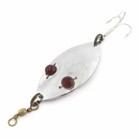 Червоні скляні очі є головною особливістю цієї металевої коливалки, виступаючи візуальною точкою атаки для хижака під час повільної проводки, необхідної для щуки у літню спеку. Маючи довжину 3" (7,5 см) та вагу 1 oz (25 г), срібний корпус має штампування з назвою Hofschneider та адресою в Рочестері, штат Нью-Йорк. Дві червоні намистини закріплені крізь корпус, вловлюючи світло та імітуючи поранену рибку на фоні яскравого срібного покриття. На зворотному боці штампування містить номер патенту 1,847,397. Цей конкретний екземпляр оцінюється в стані 4/5, має чисту світловідбивальну поверхню та оригінальну фурнітуру. Коливалка оснащена трійником у хвостовій частині та вертлюжком у носовій частині для запобігання перекручуванню жилки. Код товару 24579.
