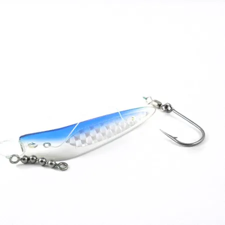 Ця вінтажна оснастка для тролінгу довжиною рівно 8 см (3 1/4 дюйма) є зразковим виробом американської компанії Luhr Jensen. Модель із артикулом 1170, Hot Spot Apex 3, має спинку світло-блакитного кольору, що переходить у білий бік, оздоблений світловідбивним візерунком «ромбоподібна луска». При вазі 7 г (1/4 унції) приманка оснащена повідцем із монофільної волосіні, гострим одинарним гачком та каскадом підшипникових вертлюжків — фурнітурою, необхідною для запобігання перекручуванню жилки під час тролінгу. Оскільки цей екземпляр не був у використанні, він зберіг оригінальне заводське покриття, а його стан оцінюється на 5 із 5. Вигнутий профіль, подібний до коливалки, є характерним для серії Apex, розробленої для використання за флешерами або доджерами.
