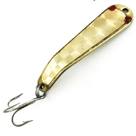 На гладкій золотистій поверхні зі зворотного боку чітко викарбувано назву «HUS LURE» та маркування ваги цієї вінтажної блешні масою 1/4 унції (7 г). При довжині 2 дюйми (5 см), її лицьовий бік має виразне карбування у формі ромбовидної луски, що створює яскраві полиски під водою. Цей екземпляр від Luhr Jensen (артикул 5620) зберіг оригінальні червоні акценти в головній частині, хоча їхні краї дещо згладилися на тлі золотистого корпусу. Виготовлена в США, ця приманка має вузький профіль, розроблений для того, щоб легко пробивати поверхневу течію та досягати придонних горизонтів. Оснащення складається з подвійного заводного кільця, на якому закріплено стандартний трійник. Попри певні сліди часу, блешня перебуває у стані 4/5 і зберігає яскравий дзеркальний блиск. Ця модель переважно використовується для ловлі в закид на річках, де течія забезпечує приманці необхідну гру, або для легкого тролінгу.