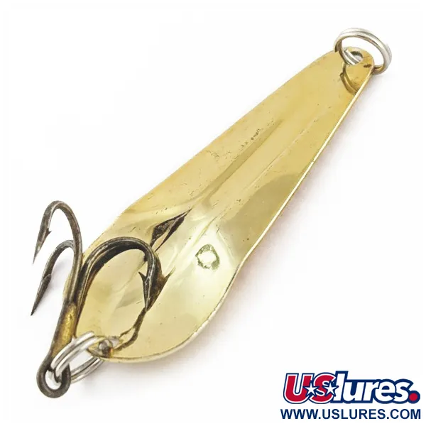Ця золота коливна блешня довжиною 7 см (2 3/4") має краплеподібну форму, що забезпечує класичний профіль для закидання у прісній воді. Вага 12 г (2/5 унції) робить її універсальною для використання на різних глибинах. На ввігнутій внутрішній поверхні викарбувано ім'я Haver, що відсилає до розробки Percy Haver початку 1930-х років. Позолочене покриття цього виробу James Aitken залишається чистим і ефективно відбиває світло. Артикул 24473 зберігся в ідеальному стані 5/5, демонструючи чітке штампування та гладкі краї, притаманні цьому виробнику. Важкий хвіст і вузька носова частина створюють традиційний для тієї епохи розподіл ваги.