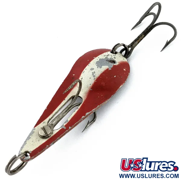 Червоно-біле краплеподібне тіло цієї блешні James Aitken Muskielure вагою 3/4 унції (21 г) є раннім зразком потужних американських снастей. При довжині 2 3/4 дюйма (7 см) приманка має унікальну конструкцію-незачіпляйку: один гвинт фіксує підпружинений гачок на лицьовій стороні блешні. Персі Гейвер розробив таке оснащення на початку 1930-х років для облову коряжника та водоростей, де зазвичай тримається трофейний маскінонг. Металевий корпус із артикулом 18524 має природні сліди використання, що відповідає оцінці стану 4/5. Фарбоване покриття залишається чітким, попри потертості, крізь які проглядає метал. Міцне заводне кільце у хвостовій частині надійно утримує оригінальний трійник.