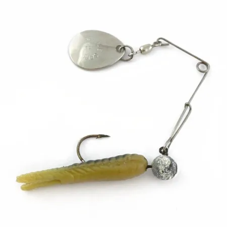 На нікельованій пелюстці у формі краплі чітко видно автентичне маркування, що ідентифікує цю класичну модель американського виробництва. При вазі 3/16 унції (5 г) ця компактна приманка має довжину 2 дюйми (5 см) і побудована на простому дротяному каркасі за типом шпильки. Нефарбована свинцева джиг-головка оснащена м’яким силіконом із роздвоєним хвостом у жовто-білому забарвленні. Артикул товару — 23914; фурнітура цього екземпляра в ідеальному стані (5/5), вертлюжок та дріт зберегли чистий блиск. Ця конструкція вже багато десятиліть залишається фаворитом для ловлі окуня та іншої дрібної риби завдяки тому, як верхня пелюстка розташована прямо над жалом гачка.