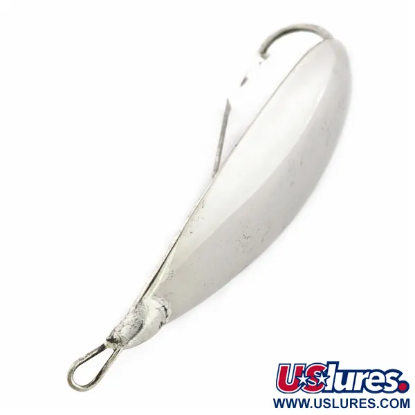 Ця блешня, виштампувана зі сплаву міді та цинку, має характерне потовщення в центрі, яке допомагає зберігати вертикальне положення під час проводки. Ця конкретна Johnson Silver Minnow Weedless з яскравим нікелевим покриттям має стан 5/5, що свідчить про виняткову збереженість. Блешня вагою 2/5 унції (12 г) і довжиною 2 1/4" (6 см) оснащена фірмовим дротяним захистом (вусами), призначеним для проходження крізь густу рослинність без зачепів. На відміну від сучасних версій, цей примірник #24548 походить з класичної епохи виробництва в США. Широке тіло блешні налаштоване на коливання з амплітудою 270 градусів, створюючи відблиски донизу та вбік, де найімовірніше атакує хижак. Така конструкція мінімізує перекручування волосіні завдяки стабільному ритмічному руху у воді. Цю модель часто поєднують з підсадкою з маринованої свинячої шкіри (pork rind) для додаткової візуальної привабливості, при цьому гра блешні залишається стабільною навіть з об'ємним трейлером. Гачок інтегрований безпосередньо в тіло, щоб жало завжди було спрямоване вгору, ефективно імітуючи силует дрібної рибки серед латаття чи трави.