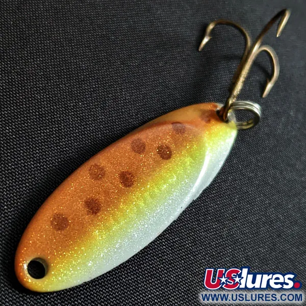 Оздоблена класичним забарвленням під струмкову форель, ця металева блешня довжиною 5,2 см (2 дюйми) має виразний градієнт від помаранчевого до жовтого, що переходить у білий колір ближче до хвоста. Цей Acme Kastmaster (артикул 19445) важить 10,5 г (3/8 унції) і демонструє традиційну якість виготовлення, притаманну виробам зі США. Конструкція виконана зі спеціального сплаву, збалансованого відповідно до унікальних пропорцій приманки для стабільної гри під час проведення або на вільному падінні. На зворотному боці золотистого металу помітні незначні поверхневі подряпини та легкі сліди зносу, що відповідає оцінці стану 4/5. Оснащення включає трійник із бронзовим покриттям, закріплений на міцному заводному кільці. На мерехтливу верхню поверхню нанесені темні круглі цятки, що імітують природну здобич і створюють високий контраст на фоні дзеркальної основи.
