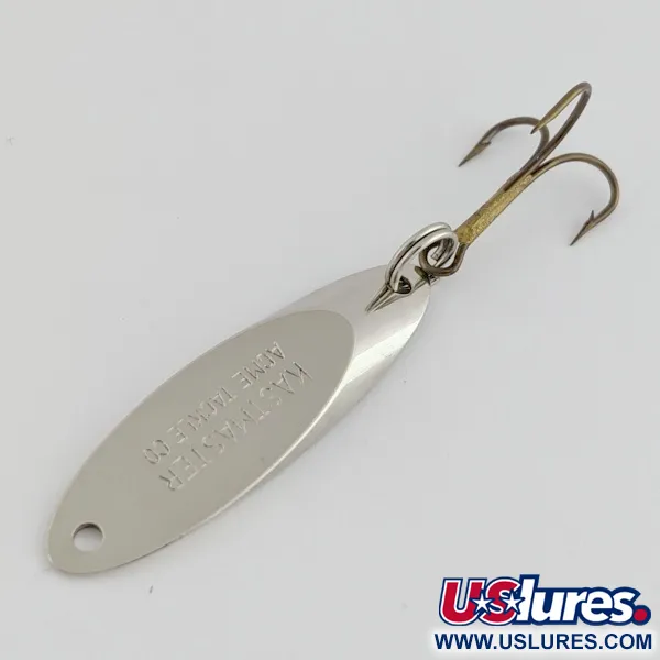 На металі цієї блешні довжиною 1 3/4" (4,5 см) викарбовано класичне маркування «KASTMASTER ACME TACKLE CO». Міцне нікелеве покриття поверх суцільної латуні забезпечує яскравий відблиск у воді. Вага 1/4 унції (7 г), аеродинамічна форма спеціально збалансована для далекого закидання та джигінгу на великій глибині. Цей екземпляр з артикулом 24449 зберігає охайний вигляд, що свідчить про високі стандарти виробництва Acme Tackle. Точні зрізані краї та зміщені кути створюють унікальну гру як під час проводки, так і на падінні. Оцінка 5/5, нікельована поверхня залишається блискучою та гладенькою по всьому корпусу. Бронзовий трійник встановлено для лову різноманітних хижаків у прісній та солоній воді.