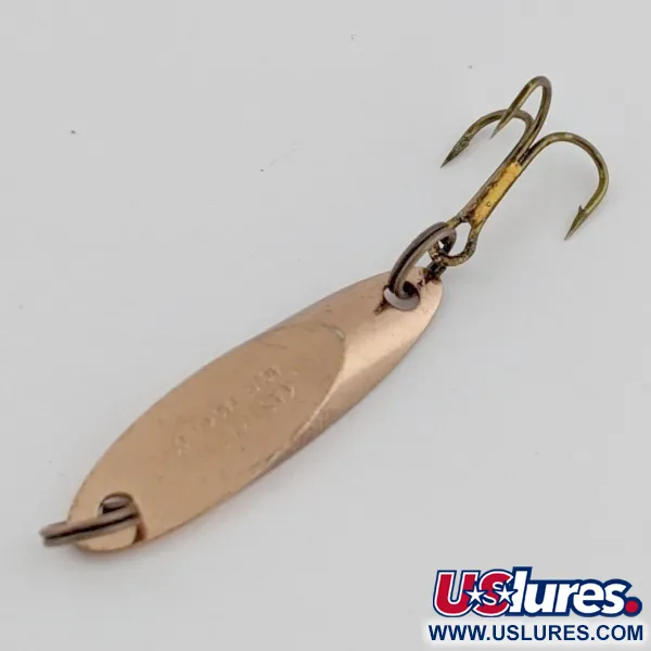 Поверхня цієї невеликої металевої блешні вагою 2,5 г (3/32 унції) вкрита теплим мідним відтінком, що забезпечує м’який відблиск порівняно зі стандартними хромованими покриттями. При довжині 3 см (1 1/4") суцільне тіло має характерний профіль з косим зрізом, розроблений компанією Acme для балансу та дальніх закидів. На металі чітко викарбовано напис «KASTMASTER ACME TACKLE CO», що підтверджує оригінальне походження. Мідне покриття часто обирають для риболовлі у каламутній воді або у похмурі дні, коли потрібне м’якше відображення світла. У хвостовій частині встановлено оригінальний трійник бронзового відтінку. Блешня знаходиться у відмінному стані (оцінка 5/5). Її аеродинамічна форма дозволяє ефективно використовувати різні техніки: від вертикального джигінгу до рівномірної проводки на течії. Артикул 24511.