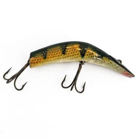 Малюнок луски, нанесений вручну, плавно переходить від темно-зеленого кольору на спинці до теплого медово-жовтого на боках цього Kautzky Lazy Ike завдовжки 7 см (2 3/4"). Дерев'яний корпус свідчить про те, що це рання модель, виготовлена ще до переходу компанії на пластик у 1960 році. Приманка під артикулом 21910 важить приблизно 7 г (1/4 oz) і має впізнавану вигнуту форму тіла, яка стала символом історії бренду. Джозеф Кауцкі, австрійський іммігрант і колишній збройовий майстер, забезпечив таку точність виготовлення цих приманок ручної роботи, що вони здобули славу функціональних витворів мистецтва. Оснащення складається з двох трійників (на черевці та у хвості), закріплених за допомогою автентичних петель-шурупів. Стан збереження оцінюється на впевнені 4/5: темні трикутні мітки на боках залишилися чіткими та виразними на жовтому фоні. Кожна лінія та вигин різьблення нагадують про майстерню в штаті Айова, де компанія Kautzky Manufacturing розпочала свій шлях у виробництві рибальських снастей у 1930-х роках.
