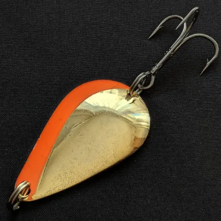 Флуоресцентне покриття є візитною карткою певних моделей Acme, і яскрава помаранчева смуга на цій конкретній блешні чудово це демонструє. При вазі 3/4 унції (21 г) та довжині 2 1/4 дюйма (5,5 см), ця блешня K.O. Wobbler (артикул 18251) поєднує в собі поліровану золотисту поверхню з яскравим помаранчевим елементом. Перехід фарби чіткий, а здатність помаранчевого пігменту реагувати на ультрафіолет забезпечує додаткову видимість в умовах слабкого освітлення. Ця приманка виробництва США представлена у стані 5/5, металеве покриття та фарба виглядають надзвичайно чистими та збереженими. Одинарний трійник надійно закріплений за допомогою заводного кільця у хвостовій частині, а переднє заводне кільце призначене для кріплення волосіні. Технічні характеристики цієї моделі свідчать, що вона розроблена для створення вібрацій та гри, які імітують малька для приваблення хижака.
