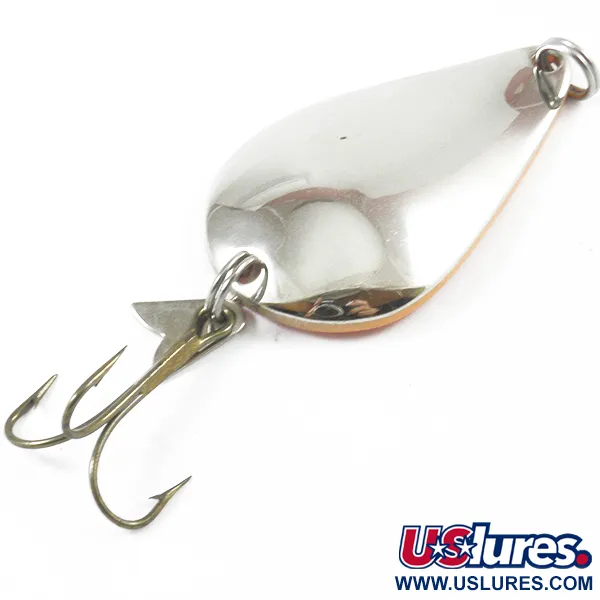 Хромоване та нікелеве покриття нанесено на зовнішній опуклий бік цієї блешні-коливалки у формі краплі, що поєднується з яскравим насиченим помаранчевим кольором на внутрішній стороні. При вазі 21 г (3/4 oz) та довжині 5,5 см (2 1/4"), ця Acme K.O. Wobbler оснащена фірмовим елементом «Sonic flipper tail» — невеликою металевою пелюсткою, закріпленою на задньому заводному кільці поруч із трійником. Ця виготовлена у США модель під артикулом 3226 має стан 5/5, вирізняючись чистим покриттям та добре збереженими гачками бронзового відтінку. Корпус виготовлено з товстого металу, що характерно для підходу компанії Acme до створення приманок із великою масою для далекого та точного закидання. Контраст кольорів між яскравою помаранчевою внутрішньою частиною та дзеркальним нікелевим покриттям зовні залишається чітким та виразним по всій поверхні приманки.