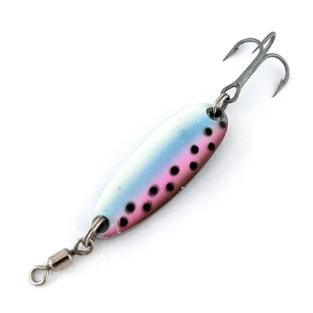 Опукла сторона цієї коливалки вагою 7 г (1/4 унції) має забарвлення під райдужну форель: колір плавно переходить від перламутрово-білого вгорі до ніжно-блакитного з рожевою бічною смугою та чорними цятками. На зворотному боці з полірованого нікелю чітко викарбувано назву бренду Luhr Jensen та назву моделі «Krocodile» — це універсальна приманка завдовжки 3,5 см (1 1/2 дюйма). Ця модель під артикулом 13726 є класичним зразком американських снастей, розроблених як для закидання, так і для тролінгу. Оснащення залишилося оригінальним: у носовій частині через заводне кільце встановлено вертлюг, а у хвості — гострий трійник. Ця модель вирізняється характерною грою під час проводки, що технічно точно імітує рухи природної здобичі. Стан приманки оцінюється на 5/5: металева поверхня чиста та дзеркальна, а лакофарбове покриття зберегло свою насиченість. Завдяки зміщеному вперед центру ваги приманка має чудову дальність закидання попри свій компактний розмір.