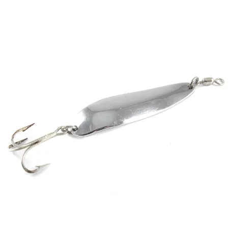 Поліроване хромоване покриття підкреслює чисті, витончені лінії цієї коливної блешні Luhr Jensen. Завдяки вазі 21 г (3/4 унції), Krocodile має товстіший металевий корпус порівняно з традиційними тонкими блешнями, що дозволяє виконувати далекі закиди навіть при сильному зустрічному вітрі. Цей конкретний екземпляр з артикулом 1515 має довжину 6,5 см (2 1/2") і не був у використанні. На ввігнутій стороні наявне чітке та глибоке заводське маркування бренду й моделі — характерна ознака цих класичних американських приманок. Фурнітура залишилася оригінальною та блискучою: вона складається з міцного трійника та заздалегідь встановленого вертлюга в носовій частині для запобігання перекручуванню жилки. Оскільки це нова приманка (Стан: 6), металева поверхня зберегла свій первісний дзеркальний блиск. Особлива форма блешні розроблена для створення стабільної коливної гри на різних швидкостях проводки, що робить її універсальним інструментом для лову як прісноводного лосося, так і різних морських хижаків.
