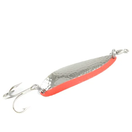 Карбована нікелева поверхня на опуклому боці відбиває світло під будь-яким кутом, що робить цю 28-грамову (1 унція) блешню помітним елементом у будь-якій рибальській коробці. Яскраво-помаранчева смужка вздовж краю тіла приманки додає помітний кольоровий акцент до металевого покриття. Ця блешня Luhr Jensen Krocodile довжиною 8,5 см (3 1/4") з артикулом 1531 вважається базовою приманкою як для ловлі в закид, так і для тролінгу. Зворотний бік блешні гладенький та дзеркально відполірований, з глибоким тисненням назви виробника та моделі. Цей примірник не був у використанні, зберіг оригінальний заводський блиск та гостру фурнітуру. Міцний трійник і вертлюжок у носовій частині закріплені за допомогою потужних заводних кілець, що гарантує готовність приманки до великих навантажень. Товщина металу вказує на те, що конструкція розрахована на далекі закиди та досягнення глибин, де тримається великий хижак.