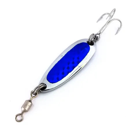 По центру цієї блешні довжиною 3,5 см наклеєна насичено-синя призматична плівка, що виблискує завдяки чіткому візерунку під луску. При вазі 7 г ця Luhr Jensen Krocodile є базовим елементом арсеналу для тих, кому потрібна компактна приманка, що завдяки своїм характеристикам чудово підходить для далекого закиду. На зворотному боці нанесено класичне штампування з назвою бренду Luhr Jensen та моделі Krocodile. Оснащення цього екземпляра (артикул 15647) включає міцний вертлюжок у носовій частині та гострий трійник у хвості, з’єднані надійними заводними кільцями. Блешня не була у використанні та повністю зберегла заводський блиск полірованого нікелевого покриття. Вузьке тіло з товстого металу — це візитівка серії Krocodile, розробленої для ефективної ловлі у закид або тролінгом.