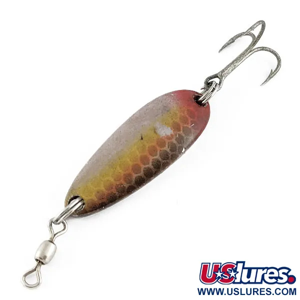 Виконана у класичному забарвленні під коричневу луску, що переходить крізь золотисті відтінки у темно-червоний колір, ця 4-сантиметрова (1 1/2") блешня стане універсальним елементом будь-якої рибальської скриньки. На полірованій сріблястій зворотній стороні чітко викарбувано назву Luhr Jensen та логотип Krocodile, що підтверджує автентичність приманки. При вазі 9 г (1/3 унції) корпус із товстого металу оснащений надійним бочкоподібним вертлюгом у носовій частині для запобігання перекручуванню жилки та гострим трійником ззаду. Цей конкретний екземпляр (артикул 21518) оцінюється на 4/5 за станом: поверхня чиста, помітні лише незначні потертості фарби від використання. Блешня розроблена для закидання, тролінгу або вертикального джигування, а її масивний профіль забезпечує стабільну гру на різних швидкостях проводки.