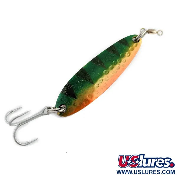 На зворотному боці кольору латуні чітко викарбувано напис, який ідентифікує цю 10-грамову (1/3 унції) коливалку як Luhr Jensen Krocodile №3, виготовлену в Гуд-Рівер, штат Орегон, артикул 15846. Покриття корпусу завдовжки 5,5 см (2 1/4 дюйма) виконане у традиційному кольорі Tiger: насичений зелений верх плавно переходить у яскраво-помаранчеве черевце, доповнене чіткими чорними вертикальними смугами. Ледь помітне тиснення вздовж боків додає металевій поверхні особливої фактури. Стан цього екземпляра оцінюється на 4 з 5: на прозорому лаку помітні незначні мікротріщини, що підкреслюють його справжній вінтажний статус. Фурнітура добре збережена і включає міцний трійник та вертлюжок у носовій частині, що запобігає перекручуванню жилки. Вузька форма та важка штампована конструкція є фірмовою рисою серії Krocodile, спеціально розробленою для далеких закидів та лову на великій глибині. Клеймо на звороті підтверджує, що це модель штампу №3 — деталь, яку особливо цінують колекціонери історичних серій виробництва Luhr Jensen.