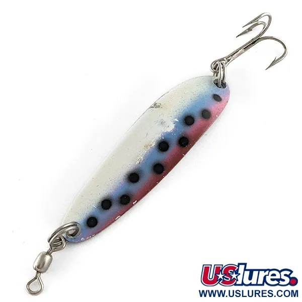 Забарвлення «райдужна форель» надає цій 10-грамовій (1/3 унції) коливній блешні Luhr Jensen характерного природного вигляду. За довжини 5,5 см (2 1/4 дюйма) модель Krocodile №3 є універсальною приманкою для закиду та тролінгу, відомою своїм вузьким і товстим профілем, що дозволяє впевнено працювати на течії та великій глибині. На зворотному боці металевого тіла чітко видно викарбуваний логотип Luhr Jensen разом із місцем походження (Худ-Рівер, Орегон), що є ознакою якості для колекціонерів, які цінують історію бренду. Цей конкретний екземпляр з артикулом 17595 має класичний візерунок із темних плям на синьо-рожевому градієнті, що імітує малька лососевих риб. Оснащення включає надійний бочкоподібний вертлюжок у місці кріплення волосіні та гострий трійник, зафіксований заводним кільцем у хвостовій частині. Помітні незначні сліди експлуатації на лакофарбовому покритті, особливо біля вушка, через що стан виробу оцінено на 4/5.