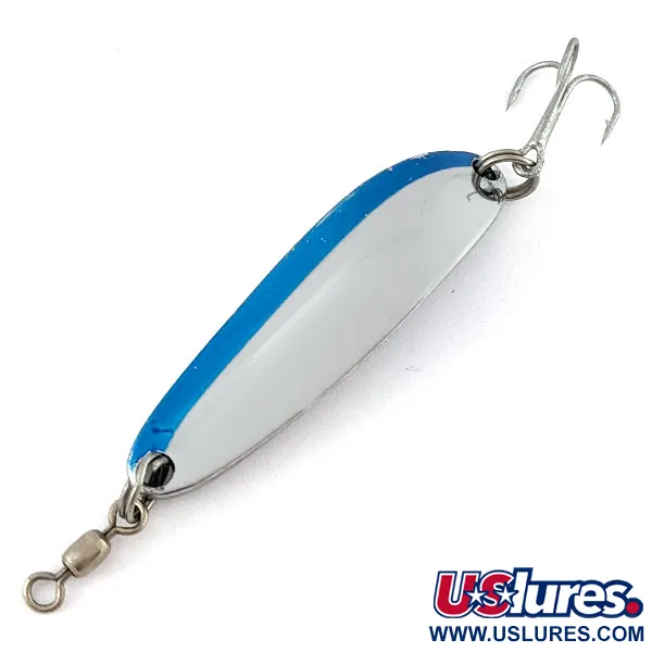 Маючи вагу 14 г (1/2 унції), ця блешня відмінно збалансована для далеких закидів та стабільного утримання горизонту на рівномірній проводці. Покриття з полірованого нікелю на опуклому боці доповнене чіткою синьою смугою вздовж одного краю — таке поєднання забезпечує високу контрастність та помітність приманки у воді будь-якої прозорості. На увігнутому звороті глибоко викарбувано назву Krocodile та клеймо виробника Luhr Jensen, що підтверджує оригінальність та модель приманки. Цей екземпляр з артикулом 20872 оснащений гострим трійником та вбудованим вертлюжком у носовій частині, який запобігає перекручуванню жилки. Стан приманки — 5/5: поверхня має яскравий відблиск, а вся фурнітура перебуває у відмінному стані.