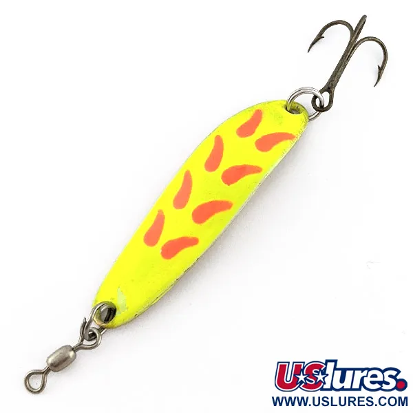 Вибиті на латунному зворотному боці маркування «DIE #3» та Hood River, Oregon підкреслюють походження цієї блешні Luhr Jensen Krocodile #3 з Тихоокеанського Північного Заходу. Ця коливна блешня довжиною 5,5 см (2 1/4") має яскраве жовте UV-покриття на лицьовій стороні, доповнене насичено-червоними акцентами у формі крапель. Завдяки вазі 9 г (1/3 унції) суцільнометалеве тіло приманки розраховане на закидання та тролінг, де компактний профіль і питома вага мають вирішальне значення. Оснащення включає встановлений спереду вертлюжок для запобігання перекручуванню волосіні та трійник, закріплений заводним кільцем у хвостовій частині. Цей екземпляр з артикулом 22832 перебуває у стані 4/5; легкі ознаки віку додають йому характеру, при цьому блешня залишається повноцінним робочим елементом снасті. Світловідбивна латунна основа створює природні відблиски, що вдало доповнюють флуоресцентне покриття при лові на глибині.