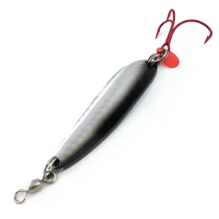Нікелеве покриття корпусу завдовжки 6,5 см (2 1/2 дюйми) забезпечує цій важкій коливалці виразні відблиски у воді. Luhr Jensen Krocodile #4 вагою 21 г (3/4 унції) має вузьке товстостінне тіло, розраховане на облов значних глибин, де зазвичай тримається хижак. Ця модель (артикул 14909) вирізняється характерним чорним градієнтом на спинці та голографічною вставкою з імітацією призматичної луски по центру. Оснащення включає яскраво-червоний трійник та невеличку червону пластикову пелюстку, що закріплені за допомогою міцного заводного кільця. У передній частині встановлено вертлюжок, який запобігає перекручуванню жилки під час далеких закидань та проведення. Стан приманки ідеальний (5/5): метал зберіг яскравий блиск, а малюнок луски не має ознак відшарування чи вицвітання. Заднє заводне кільце має збільшений розмір, що забезпечує гачку максимальну свободу рухів.