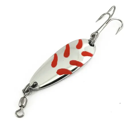 Нікель та червоні акценти визначають зовнішній вигляд цієї коливальної блешні вагою 1/4 унції (7 г) — моделі, що посіла чільне місце в арсеналі багатьох мисливців на лосося та форель. При довжині 1 1/2 дюйма (3,5 см) цей конкретний екземпляр під артикулом 7312 має класичне для Luhr Jensen оформлення: червоний візерунок, нанесений поверх дзеркально відполірованої поверхні. На зворотному боці чітко видно глибоке штампування «LUHR JENSEN KROCODILE», що є фірмовою ознакою виробів бренду. Вузька геометрія приманки з потовщенням у середній частині спеціально розроблена для дальніх закидів з берега чи човна, дозволяючи їй легко прошивати вітер та швидко досягати глибини. Цей примірник не був у використанні, тому нікелеве покриття зберегло свій первісний блиск на обох сторонах пелюстки. Оснащення залишилося оригінальним, включаючи заводський бочкоподібний вертлюжок у головній частині та стандартний трійник у хвості.