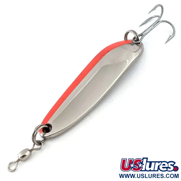 Яскрава флуоресцентна червона смужка проходить уздовж зовнішнього краю цього полірованого нікелевого тіла, створюючи чіткий візуальний контраст із дзеркальною металевою поверхнею. На увігнутому боці чітко вибито класичне маркування «KROCODILE DIE #3», що вказує на виріб Luhr Jensen періоду їхньої діяльності в Гуд-Рівер, штат Орегон. При вазі 1/3 унції (10 г) та довжині 2 1/4 дюйма (5,5 см) цей екземпляр з артикулом 13340 має значну товщину металу, що допомагає приманці швидше заглиблюватися. Оснащення включає потужний трійник і якісний вертлюжок у носовій частині, щоб мінімізувати перекручування жилки під час закидання або тролінгу. Вузька, звужена форма є візитною карткою серії Die #3: вона дозволяє краще прорізати повітря для дальності закиду та стабільно триматися в товщі води навіть на течії. З огляду на дзеркальний блиск покриття та цілісність усіх елементів, приманка зберігає відмінний стан 5/5. Рибалки часто покладаються на цю вагу при лові лосося чи форелі на Великих озерах або в подібних прибережних акваторіях, де потрібен компактний профіль з великою питомою вагою.