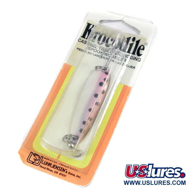 Нікелеве покриття створює основний відблиск для забарвлення «Rainbow Trout», забезпечуючи помітну здалеку гру для лову лосося чи форелі. Ця блешня Luhr Jensen Krocodile (модель №3) має довжину 5,5 см (2 1/4 дюйма) та вагу 10 г (1/3 унції) — такий профіль оптимально підходить як для далеких закидів, так і для контрольованого тролінгу. Блешня з артикулом 2073 вирізняється градієнтним переходом рожевого та сріблястого кольорів із виразними чорними цятками, що точно імітує малька форелі. Цей примірник раніше не використовувався і зберігся в оригінальній вінтажній упаковці фабрики Luhr Jensen & Sons у Гуд-Рівер, штат Орегон. Виготовлена з товстого металу, приманка демонструє характерну гру з перевалками під час проводки, не втрачаючи стабільності навіть при лові сильної хижої риби. Оснащення включає міцне заводне кільце та гострий трійник, що є запорукою надійності цього бренду. На картонній підкладці є класичне маркування «Made in USA», що робить цю блешню частиною історії американського рибальства.