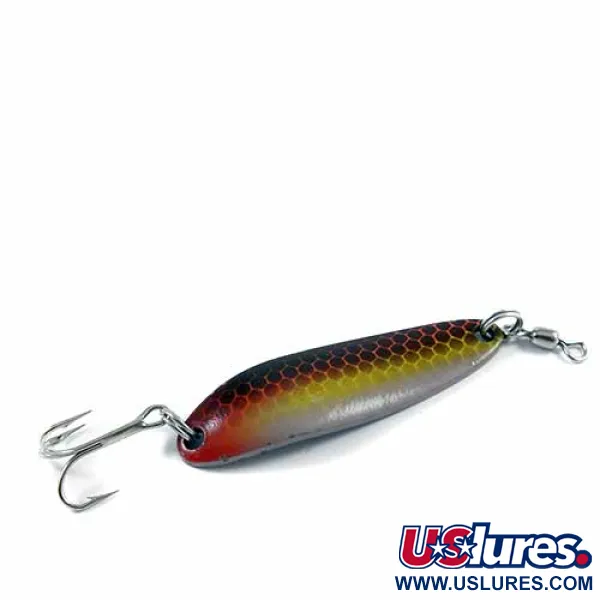 Характерний візерунок у вигляді бджолиних стільників прикрашає лицьовий бік цієї 5,5-сантиметрової (2 1/4") коливної блешні, демонструючи градієнт, що переходить від темної спинки крізь теплий коричневий та золотисто-жовтий кольори до сріблястої основи. При вазі 10 г (1/3 унції) модель Luhr Jensen Krocodile Die #3 має вузький профіль і виготовлена з товстого металу, що ідеально підходить для далеких закидів, необхідних на великих озерах чи з прибережних пірсів. На зворотному боці чітко вибито назву бренду Luhr Jensen та країну походження — США. Цей примірник під артикулом 2717 зберігся у відмінному стані з оцінкою 5/5. Оснащення включає гострий трійник та встановлений у носовій частині вертлюг, який запобігає закручуванню жилки. Важка конструкція дозволяє приманці швидко досягати глибини на течії, зберігаючи при цьому характерну розмашисту гру під час проводки.