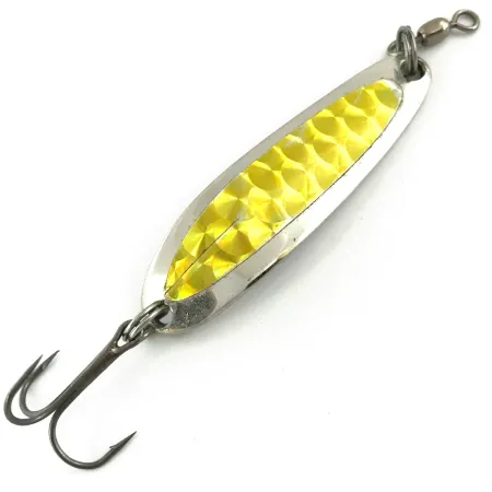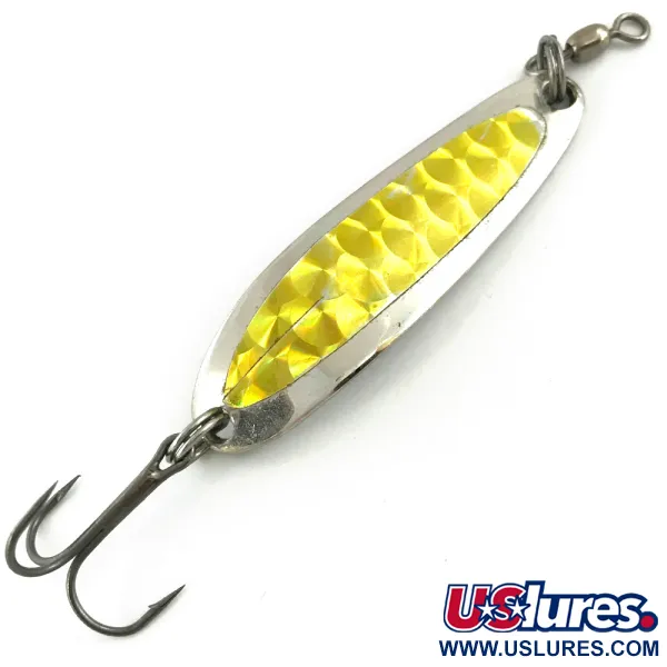 Напис «HOOD RIVER, ORE.», викарбуваний на звороті нікелевого корпусу, підкреслює класичне походження цієї блешні від Luhr Jensen. Лицьова сторона вкрита яскравою золотистою голографічною плівкою з виразним візерунком у формі стільників, яка ефективно відбиває світло під час руху у воді. Завдяки вазі 10 г (1/3 унції) та вузькому корпусу з товстого металу, ця модель Die #3 чудово підходить для далеких закидань або стабільної гри на глибині під час тролінгу. Приманка завдовжки 5,5 см (2 1/4 дюйма) оснащена міцним трійником і вертлюгом, які з’єднані надійними заводними кільцями. Висока якість виконання помітна у глибокому тисненні на звороті, де вказано номер штампа, використаного на виробництві. Стан оцінюється на 5/5: блискуче нікелеве покриття ззаду та золотиста плівка спереду повністю збережені. Це чудово збережений екземпляр із серії з артикулом 5643.