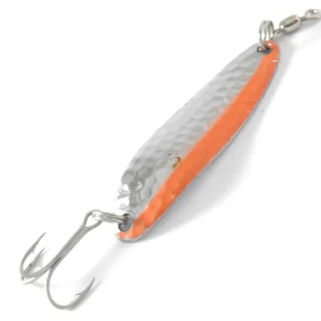 Карбована нікелева поверхня цієї класичної блешні Luhr Jensen вагою 9 г (1/3 унції) чудово відбиває світло, а вздовж одного її краю проходить виразна помаранчева UV-смужка. Модель Krocodile Die #3 UV (артикул 4089) має довжину рівно 5,5 см (2 1/4") і є універсальним варіантом для закидання, тролінгу чи навіть лову в схил. На зворотному боці блешні чітко вибито клеймо Luhr Jensen та місце її виробництва — Гуд-Рівер, штат Орегон, що підкреслює історію цієї снасті як виробу американської якості. Для риболовлі на Великих озерах або полювання на лосося під час його ходу, потовщений вузький профіль приманки розроблений так, щоб легко прорізати товщу води й досягати великих глибин. Цей екземпляр перебуває у відмінному стані (5/5), має чисте блискуче покриття карбованого металу та гострий трійник. Поєднання рельєфної фактури та UV-активної смужки робить приманку добре помітною навіть за умов слабкого освітлення. Оснащення доповнене потужним заводним кільцем та якісним вертлюжком, що запобігає перекручуванню волосіні.