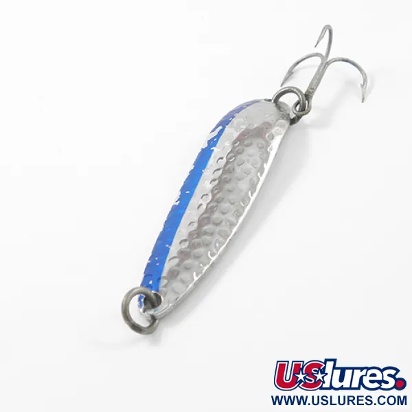 Фактура битого нікелю створює виражений рельєф із заглибленнями на лицьовій стороні цієї блешні-коливалки вагою 14 г (1/2 унції), розробленої для максимальної гри світла. Уздовж одного краю корпусу довжиною 6,5 см (2 1/2 дюйми) нанесена яскрава світловідбивна синя смужка, що створює чіткий кольоровий контраст, добре помітний у воді. На звороті приманки — гладенька полірована поверхня з чітким штампом бренду Luhr Jensen та вказівкою міста виробництва — Гуд-Рівер, Орегон. Цей примірник під артикулом 2683 оснащений міцним трійником на потужному заводному кільці. Загальний стан приманки високий і оцінюється на 4/5 завдяки збереженому блиску металу та цілісності декоративної стрічки. Вузький профіль і вдалий розподіл ваги є характерними рисами цієї американської класики, створеної для далеких закидів та тролінгу.