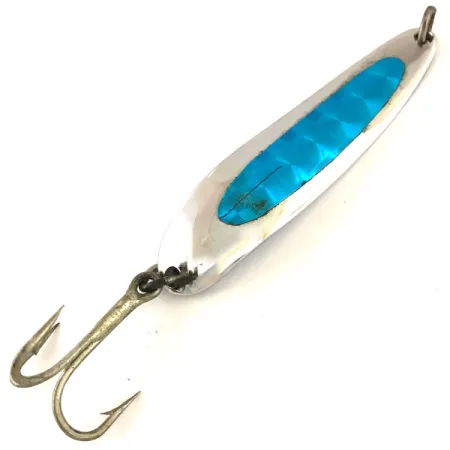 Вага 19 г (2/3 унції) забезпечує цій вузькій коливалці необхідну компактність для досягнення значної дальності закиду. На зворотному боці чітко викарбовано маркування «KROCODILE», «DIE #4» та «LUHR JENSEN HOOD RIVER, ORE», що вказує на походження приманки від відомого виробника снастей з Орегону. При довжині 6,5 см (2 1/2 дюйма) модель має класичне нікелеве покриття, доповнене світло-блакитною призматичною наклейкою з ніжним зеленим відтінком для підсилення відблисків. Блешня з артикулом 4804 виготовлена з товстішого металу, ніж стандартні коливалки, що дозволяє їй стабільно тримати глибину під час рівномірної проводки. Стан приманки відмінний (5/5), оригінальні заводні кільця та гострий трійник зберегли чисте блискуче покриття. Завдяки своїй універсальності розмір Die #4 часто використовується рибалками для лову лосося чи форелі, де необхідне поєднання ваги та компактного профілю.